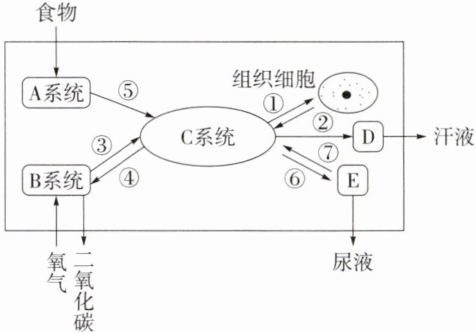 12. 图中A、B、C、D、E为人体的不同器官和系统,①~⑦为不同的生理过程,请据图回答下列问题: