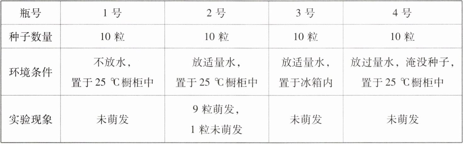 (4)2号瓶中有1粒种子未萌发,可能的原因是____(答出一条即可)。
