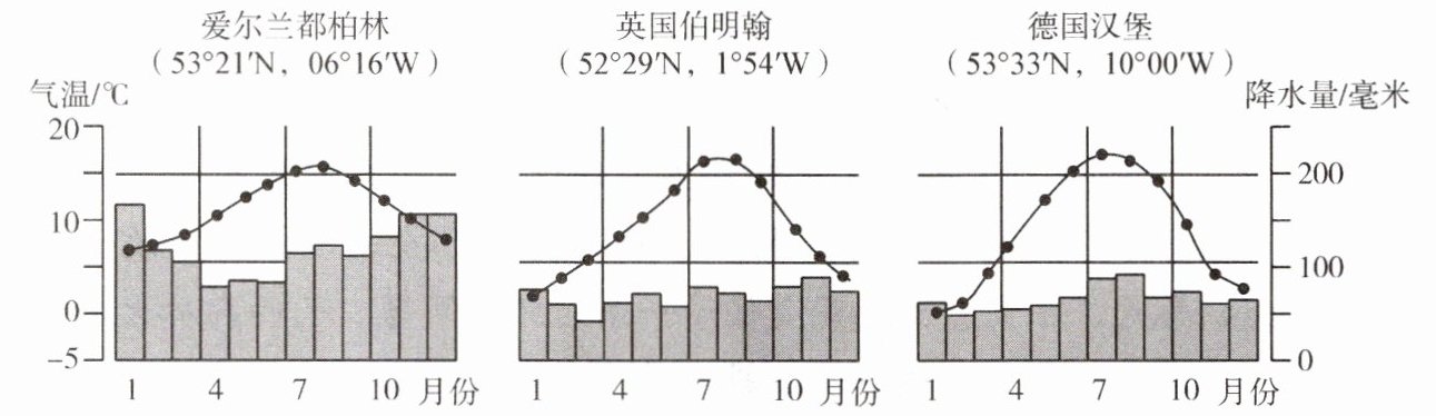 21. 读欧洲西部三地各月气温与降水量分配图,回答问题。