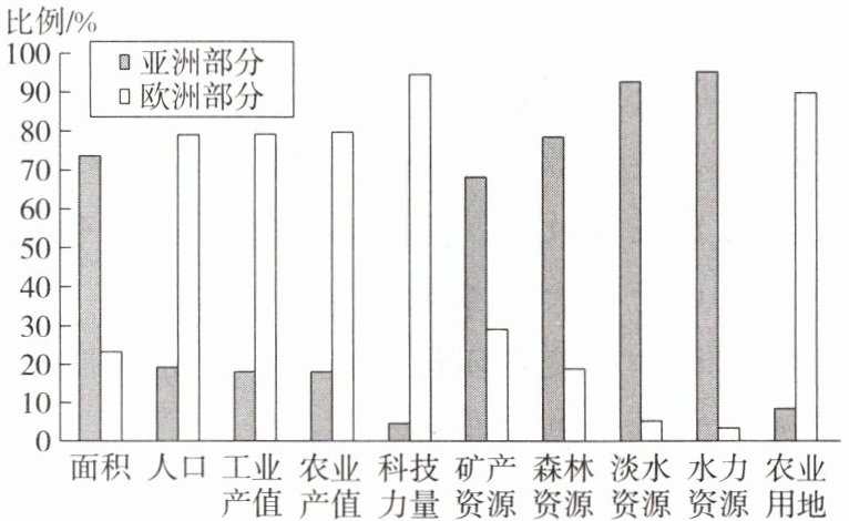 材料一 俄罗斯一些资源在亚洲和欧洲分布的比例图。
