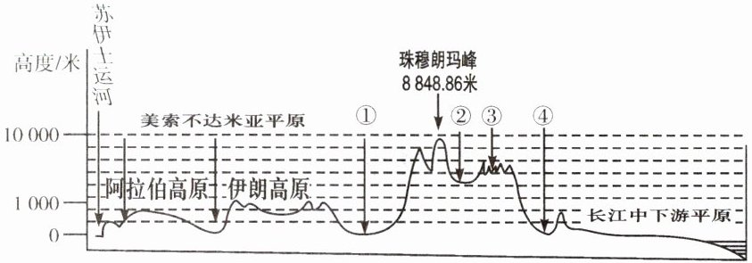 21. 读亚洲大陆沿某条纬线的地形剖面示意图,回答下列问题。