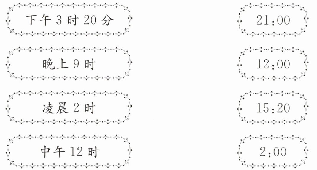 解析:本题考查24时计时法和12时计时法的转换。需要掌握转换方法,对于下午3:30,在12时计时法中,下午的时间要加上12小时再转换为24时计时法表述,这里是从24时计时法转12时计时法,直接表述即可;对于20时,用20减去12就可得到晚上对应的时刻。