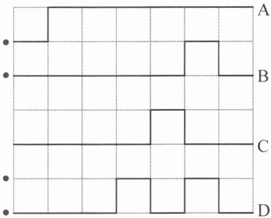 下图是汽车行驶的路线图。A、B、C、D 四位司机从右端各自的起点同时出发,沿着粗线驾车到达左端的圆点处。假如每个方格的边长都是 10 千米,A 的车速为 80 千米/时,B 的车速为 100 千米/时,C 的车速为 100 千米/时,D 的车速为 100 千米/时。那么他们四人中谁先到达终点?