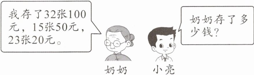 解析:本题可根据每种面值人民币的张数与面值,利用乘法分别求出每种面值人民币的总金额,再将它们相加,即可求出奶奶存钱的总金额。