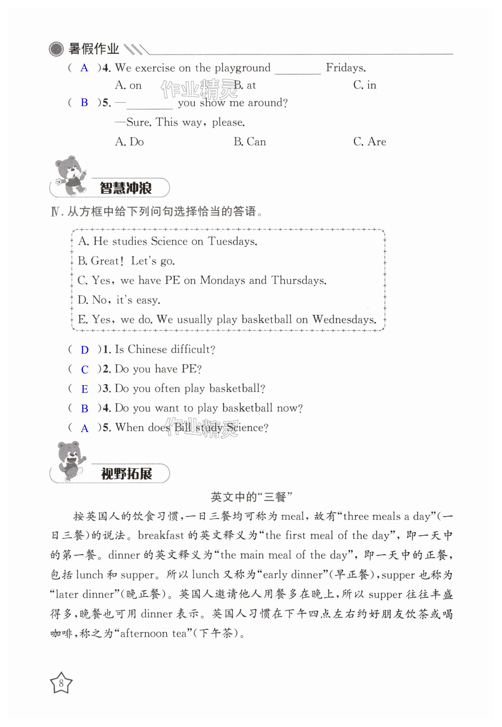 注:目前有些书本章节名称可能整理的还不是很完善,但都是按照顺序排列的,请同学们按照顺序仔细查找。练习册 2025年湘岳假期暑假作业五年级英语湘鲁教版 答案主要是用来给同学们做完题方便对答案用的,请勿直接抄袭。
