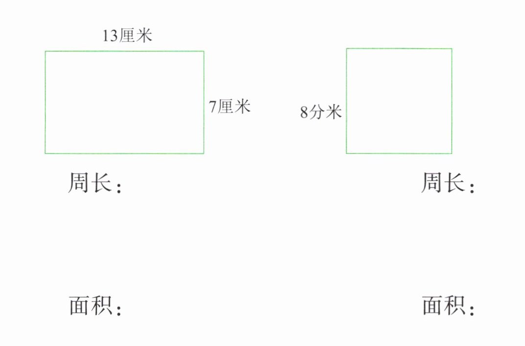 周长:根据长方形周长公式$C=(a + b)\times2$(其中$a$为长,$b$为宽),$a = 13$厘米,$b = 7$厘米,$C=(13 + 7)\times2=20\times2 = 40$厘米。