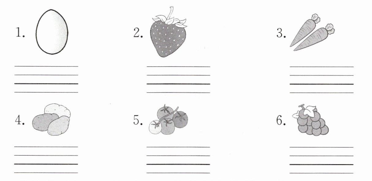 1. egg 2. strawberry 3. carrots 4. potatoes 5. tomatoes 6. grapes