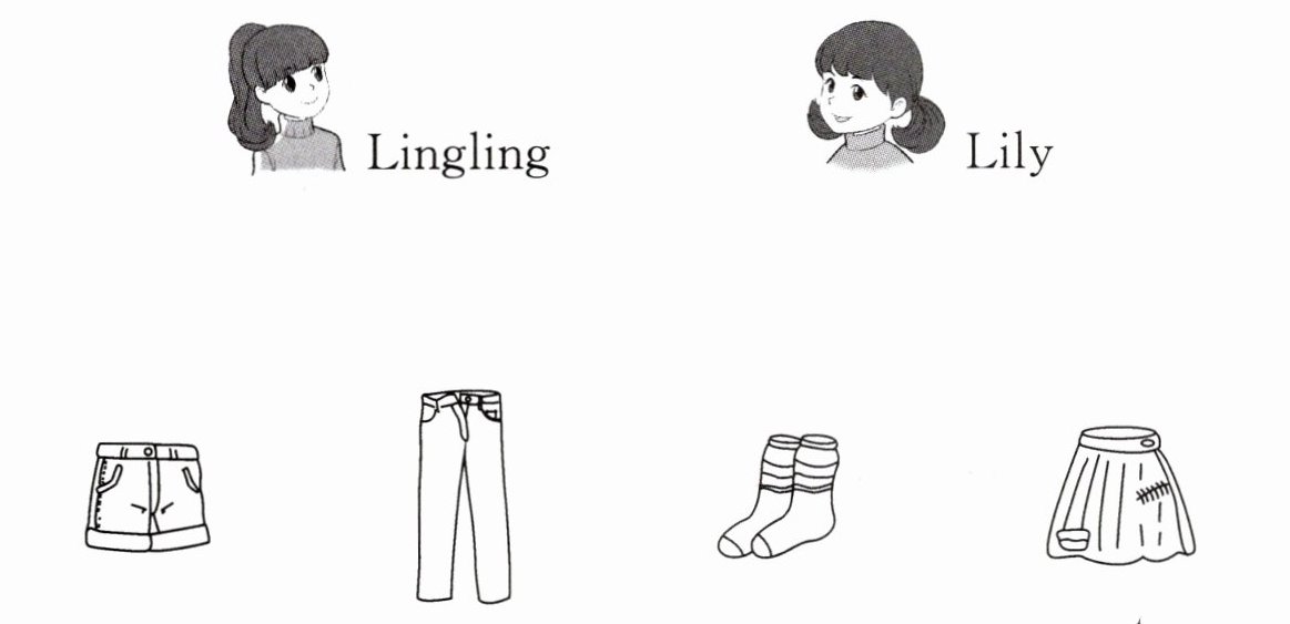 Ⅳ. 我能根据对话,将人物与相应的衣物连线,并给衣物涂色。