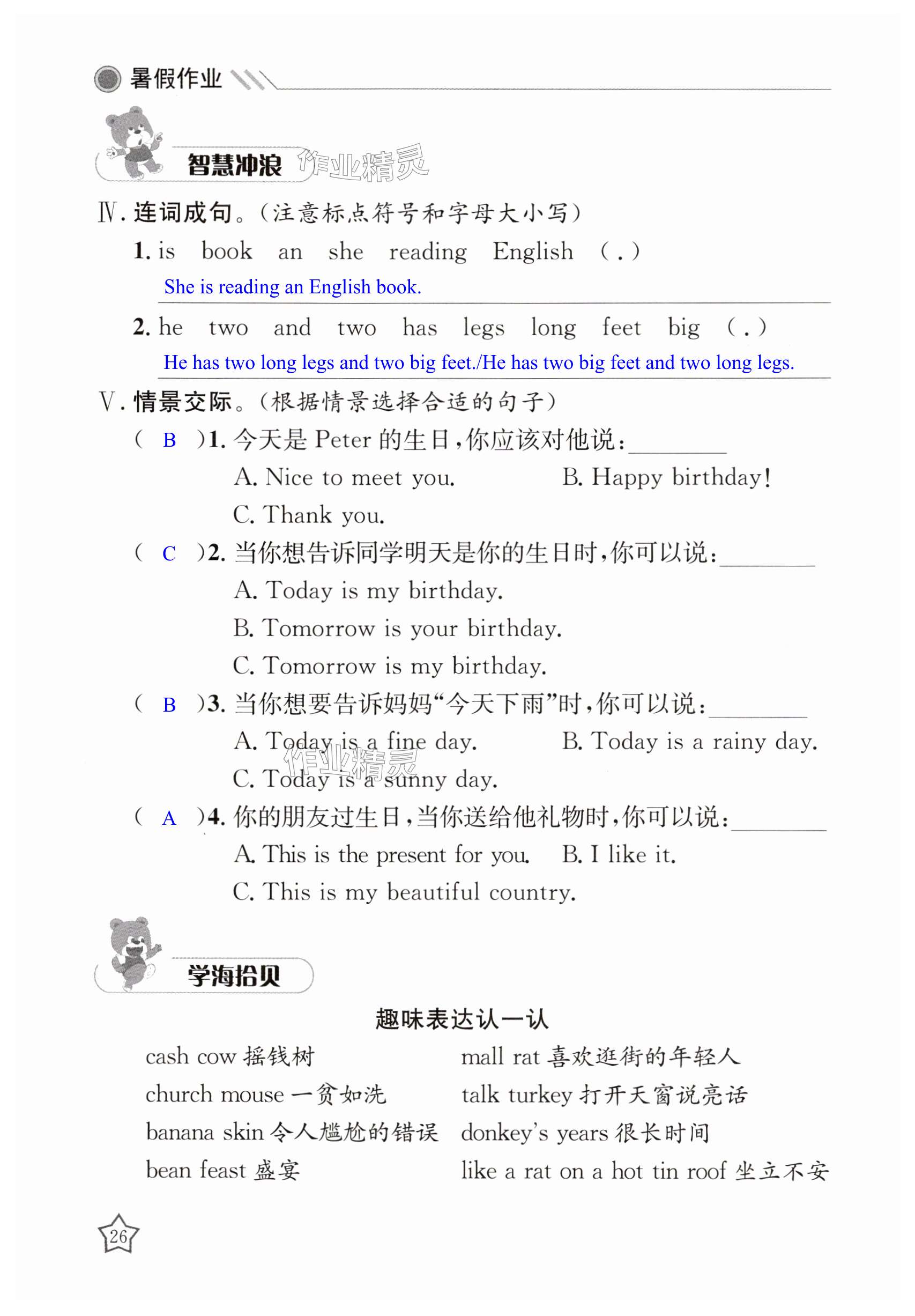 注:目前有些书本章节名称可能整理的还不是很完善,但都是按照顺序排列的,请同学们按照顺序仔细查找。练习册 2025年湘岳假期暑假作业四年级英语湘少版 答案主要是用来给同学们做完题方便对答案用的,请勿直接抄袭。