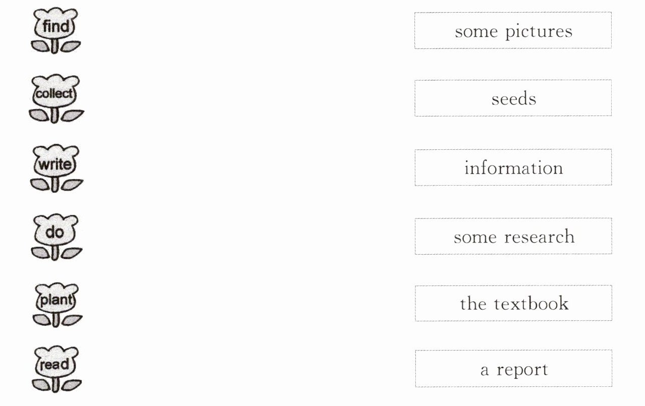 1. find information 2. collect some pictures 3. write a report 4. do some research 5. plant seeds 6. read the textbook