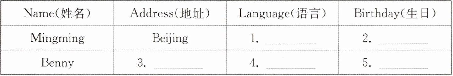 Mingming lives in Beijing. He speaks Chinese. He is eleven years old. His birthday is on the first of June. He has got a new friend. His name is Benny. Benny is twelve years old. He can speak English very well. His birthday is on the fourth of July. He lives in New York.