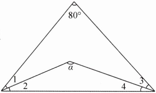 17. 如图,已知一个等腰三角形的顶角为$80^{\circ }$,$∠1= ∠2$,$∠3= ∠4$,求$∠α$是多少度。(提示:三角形的内角和是$180^{\circ }$)