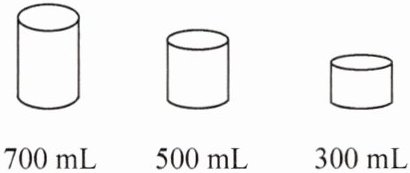 先把500mL的杯子装满水倒入700mL的杯子,再把300mL的杯子装满水倒入700mL的杯子至满,此时300mL的杯子里剩下的水就是100mL。