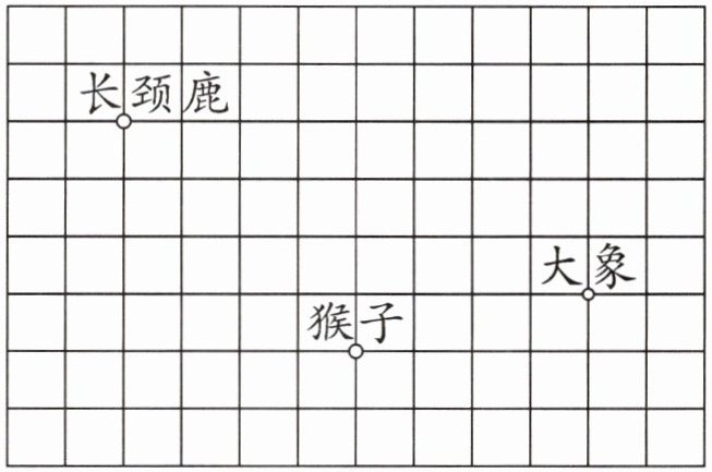 5. 动物表演 动物园里有一场特殊的表演,动物们需要在舞台上进行平移。已知舞台长12米,宽8米(如右图)。首先一只长颈鹿在舞台上向右平移了5米,接着一只大象在舞台上向左平移了3米,最后一只猴子在舞台上向上平移了2米到达秋千上。在图中标出每只动物最终的位置。