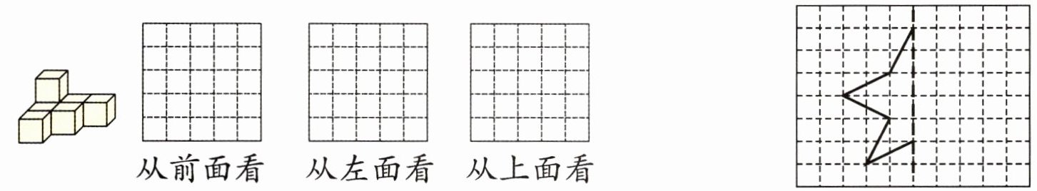 1. 在左下面方格纸上画出左边立体图形分别从前面、左面和上面看到的图形。