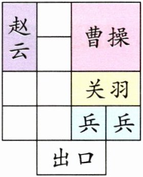 答案不唯一,如:①将下面左边的兵向左平移 1 格,再向上平移 3 格;②将下面右边的兵向左平移 2 格,再向上平移 2 格;③将关羽向左平移 2 格;④将曹操向下平移 2 格;⑤将赵云和两个兵向右平移 2 格;⑥将关羽向上平移 1 格;⑦将曹操向左平移 1 格,再向下平移即可从华容道出来。