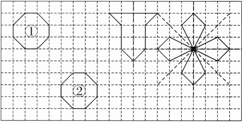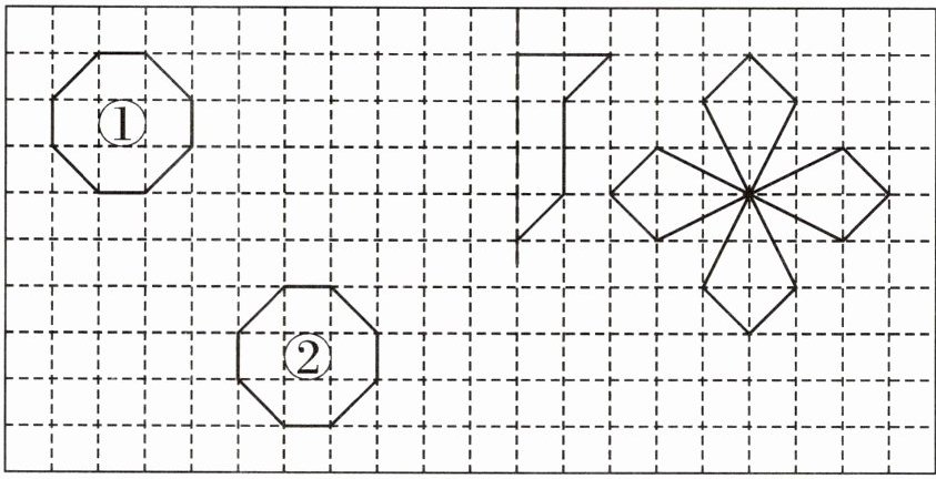 思路点拨 (1)根据平移的性质分别数出图形①向右和向下平移到图形②的格数即可求解;(2)先根据对称轴,分别找出中间图形各关键点的对称点,再依次连接即可;(3)如果一个图形沿着一条直线对折后,直线两侧的部分能够完全重合,那么这个图形叫作轴对称图形,这条直线就是它的对称轴。