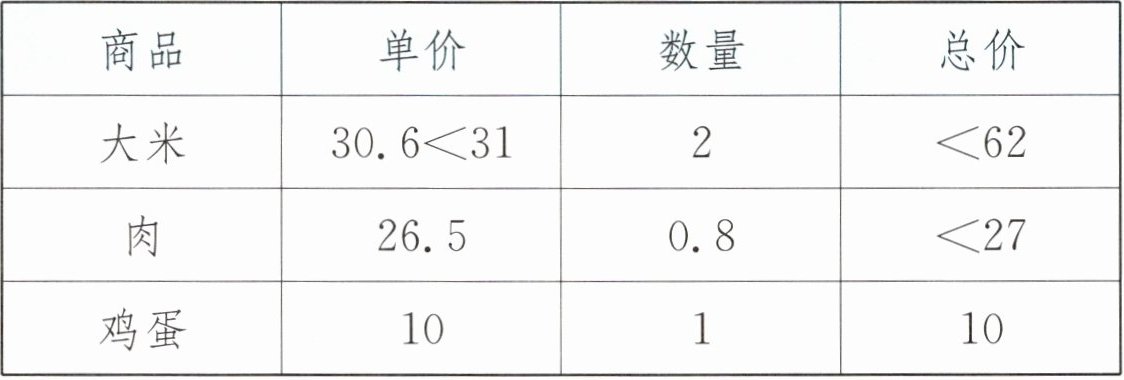 方法一:1袋大米不到31元,2袋大米不到62元;0.8kg肉不到27元;再买一盒10元的鸡蛋,总共不超过62+27+10= 99(元)。够了。(如下表)
