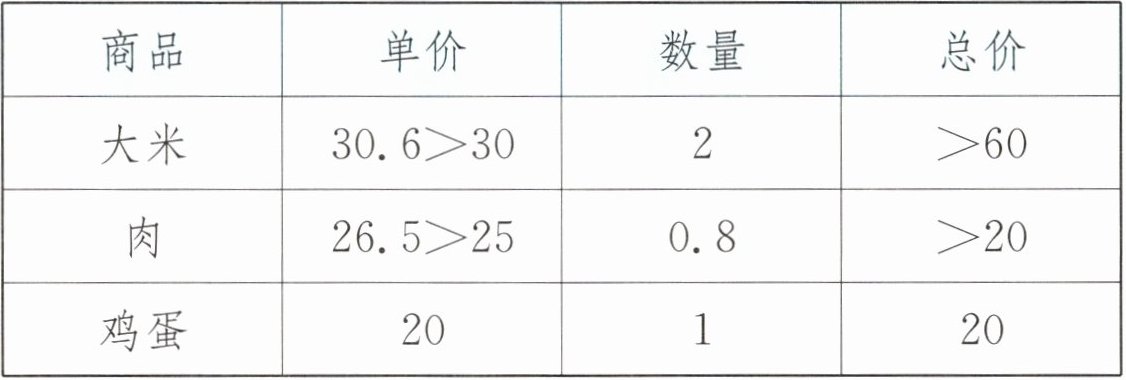方法二:1袋大米超过30元,2袋大米超过60元;1kg肉超过25元,0.8kg肉也就超过了25×0.8= 20(元)。再买一盒20元的鸡蛋,总共就超过60+20+20= 100(元),不够。(如下表)