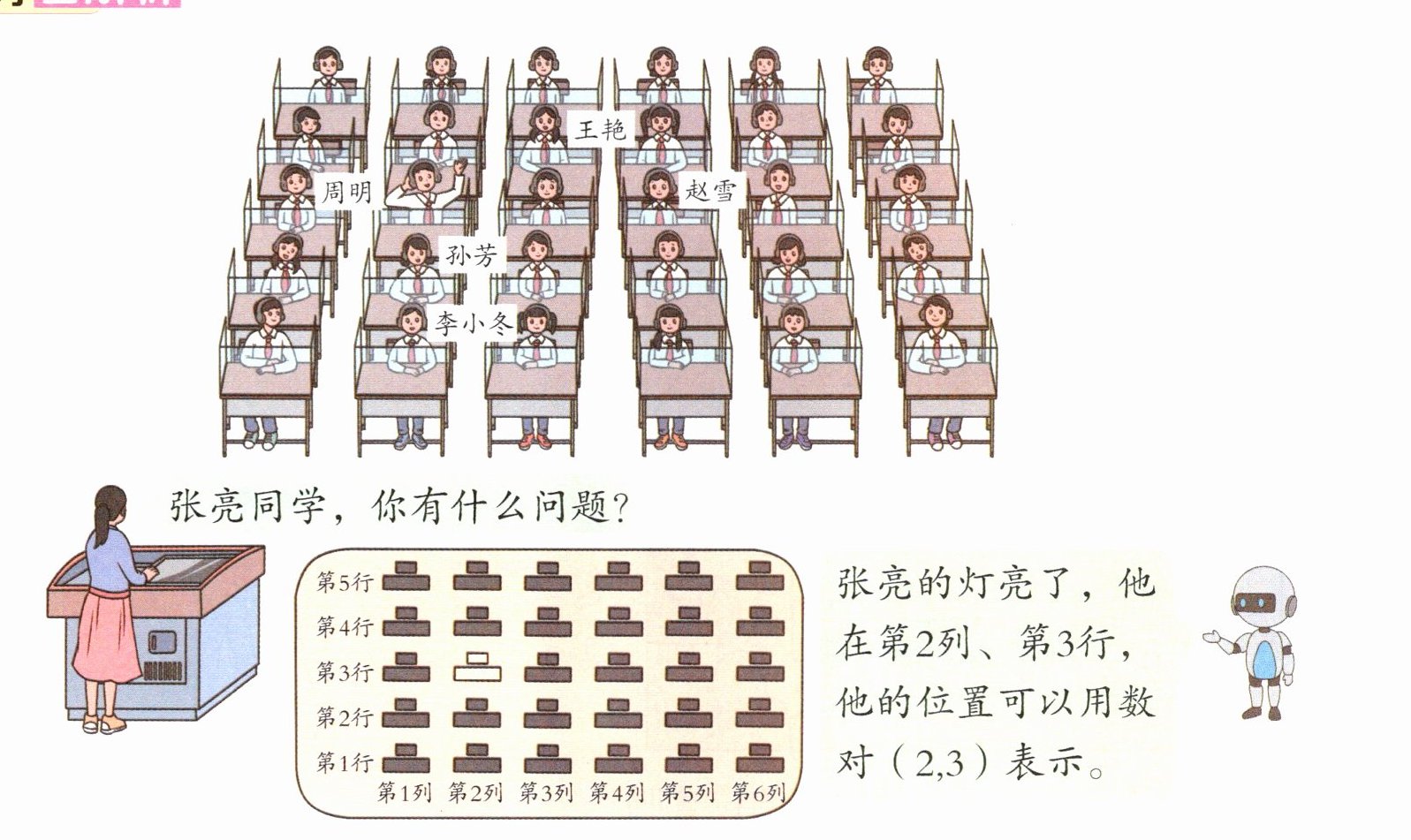 思考分析:(1)确定第几列、第几行的一般规则。从图中观察张亮同学的位置,会发现确定第几列一般是从左往右数,确定第几行一般是从前往后数。按照此方法,图中王艳同学在第3列、第4行,赵雪同学在第4列、第3行,她们所在的列与行刚好相反。