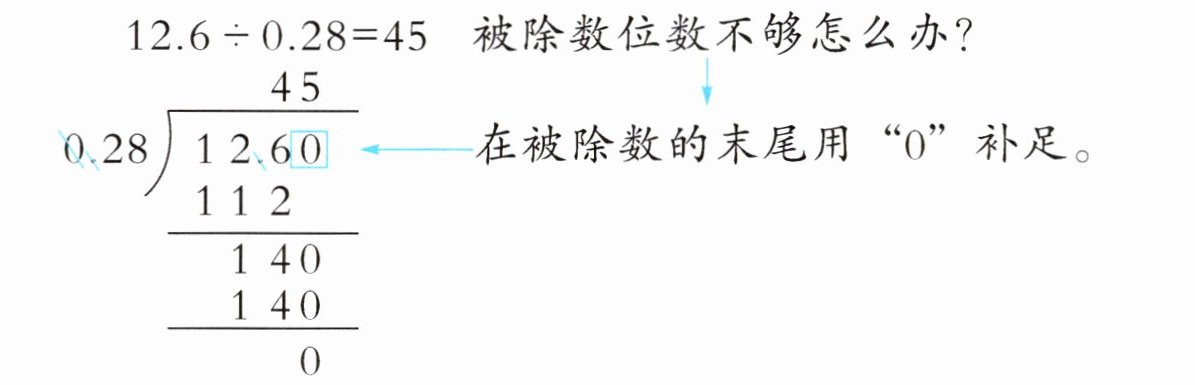 过程探索 (1)方法分析。把$12.6÷0.28$先转化成除数是整数的除法,再计算。