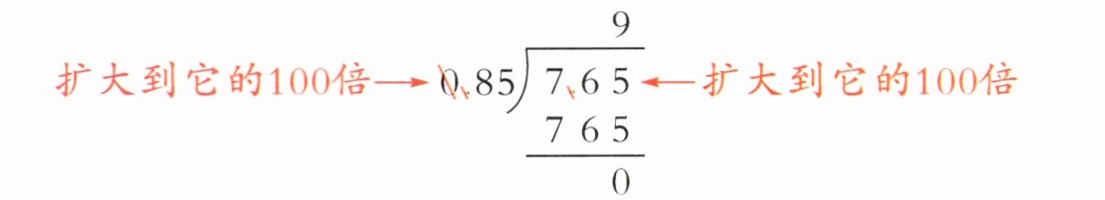 方法二:同倍扩大法。根据商不变的规律,把被除数和除数同时扩大到原来的100倍,转化成整数计算。$7.65×100= 765$,$0.85×100= 85$,因为$765÷85= 9$,所以$7.65÷0.85= 9$。