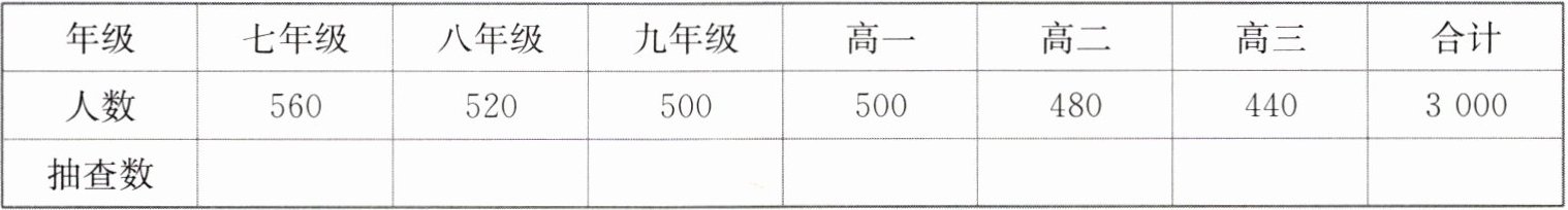 (2)在(1)的条件下,考虑到不同年级学生的视力差异,为了保证样本有较好的代表性,各年级应分别抽查多少人?将结果填写在上面的表中;
