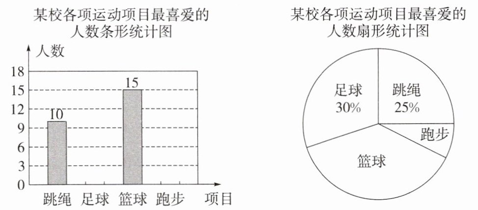 17. 某校积极开展“阳光体育”活动,共开设了跳绳、足球、篮球、跑步四种运动项目,为了解学生最喜爱哪一种项目,随机抽取了部分学生进行调查,并绘制了如下的条形统计图和扇形统计图(部分信息未给出).
