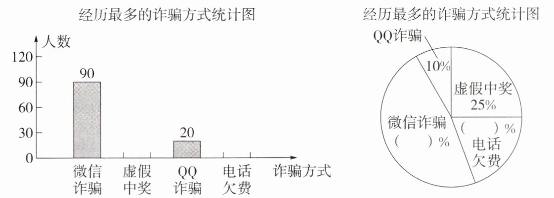 (1)根据图中的信息可知,经历虚假中奖诈骗的有()人;经历电话欠费诈骗的人数占调查总人数的()%,有()人;