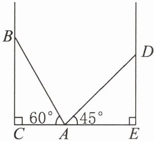 11. 如图,在两面墙之间有一个底端在 A 点的梯子,当它靠在一侧墙上时,梯子的顶端在 B 点;当它靠在另一侧墙上时,梯子的顶端在 D 点。已知∠BAC = 60°,∠DAE = 45°,点 D 到地面的距离 DE = 3√2 m,求点 B 到地面的距离。