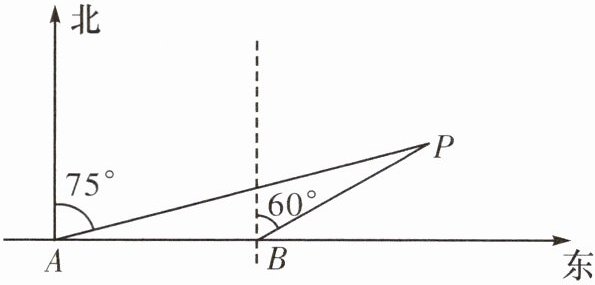 如图,为了躲避海盗,一轮船一直由西向东航行,早上 8 时,在 A 处测得小岛 P 的方向是北偏东 75°,以每时 15 海里的速度继续向东航行,10 时到达 B 处,并测得小岛 P 的方向是北偏东 60°,若小岛周围 25 海里内有暗礁,问该轮船是否能一直向东航行?