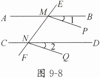 8. 如图 9 - 8,直线$AB$,$CD被直线EF$所截,$∠1 = ∠2$,$∠CNF = ∠BME$。求证:$AB// CD$,$MP// NQ$。