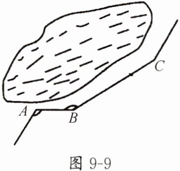 9. 如图 9 - 9,一条公路修到湖边时,需拐弯绕湖而过,如果第一次拐的角($∠A$)是$120^{\circ}$,第二次拐的角($∠B$)是$150^{\circ}$,第三次拐的角是$∠C$,这时的道路恰好和第一次拐弯之前的道路平行,问$∠C$是多少度?说明你的理由。