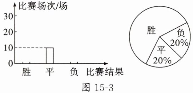 8. 图 15 - 3 是记录某足球队全年比赛结果(“胜”“负”或“平”)的条形统计图和扇形统计图(不完整).根据图中信息,该足球队全年比赛胜了____场.
