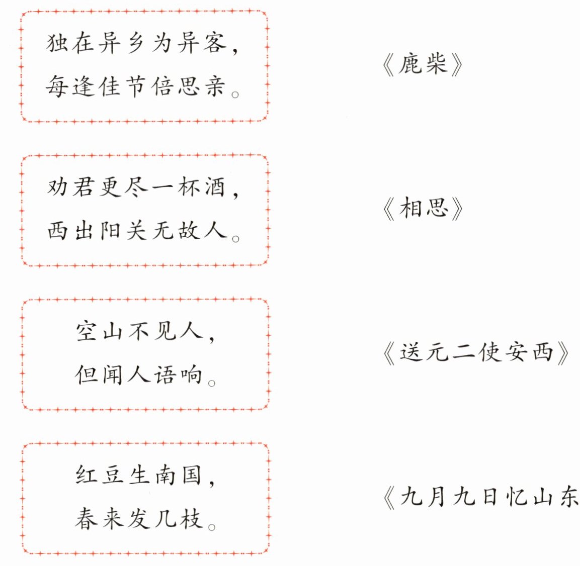 (2)“独在异乡为异客,每逢佳节倍思亲。”——《九月九日忆山东兄弟》;“劝君更尽一杯酒,西出阳关无故人。”——《送元二使安西》;“空山不见人,但闻人语响。”——《鹿柴》;“红豆生南国,春来发几枝。”——《相思》