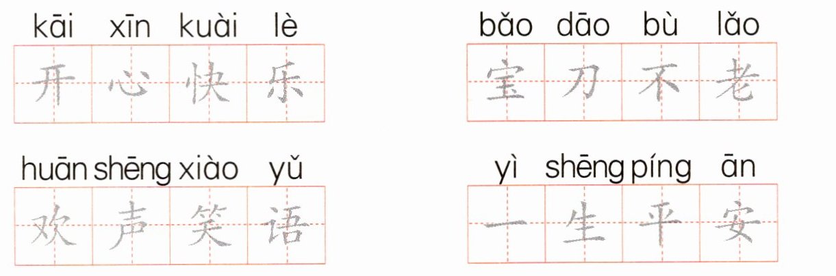 (按照图中示例,在田字格中规范描摹“开心快乐”“宝刀不老”“欢声笑语”“一生平安”)