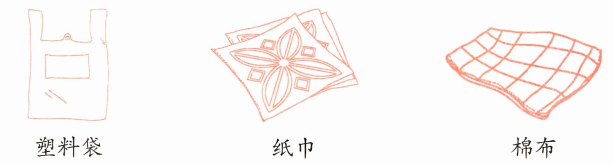 (2) 毛毛擦桌子时,不小心把装有水的杯子碰倒了。他应该选哪个物品擦桌子?在□里画“√”,并说一说理由。