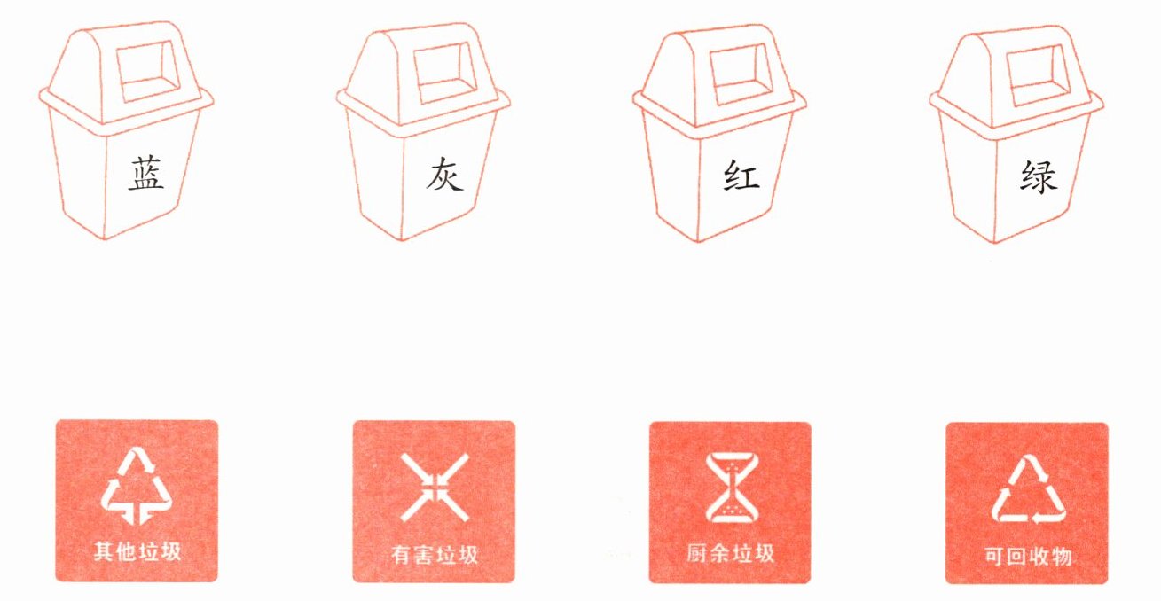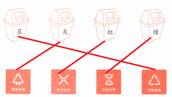 将 下 面 代 表 四 种 颜 色 的 垃 圾 桶 和 对 应 的