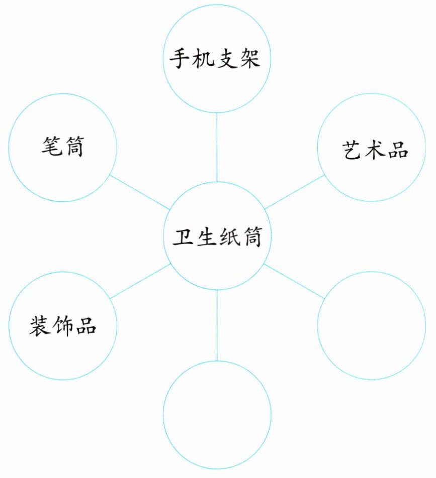 每家每户都要用到卫生卷纸,卫生纸用完了就留下了里面的纸筒。菲菲攒了许多这样的纸筒,除了卫生卷纸的,还有保鲜膜、胶带的一些纸筒。这些纸筒扔了太可惜,可大大小小的纸筒有什么用呢?现在就和菲菲来一次头脑风暴,想一想应该怎么利用纸筒。把你的想法写在圆圈中: