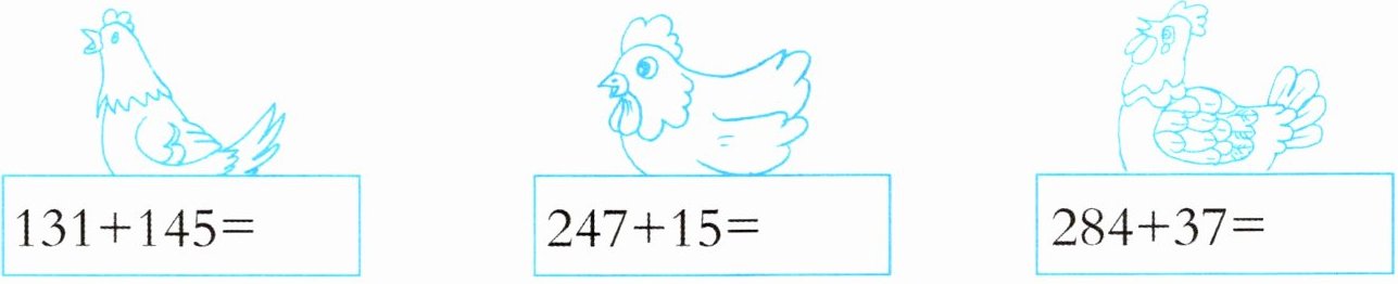 4 农场里还养了好多母鸡,每年能产很多鸡蛋。下面三只母鸡是今年产蛋最多的。你能列竖式算出它们今年的产蛋量吗?