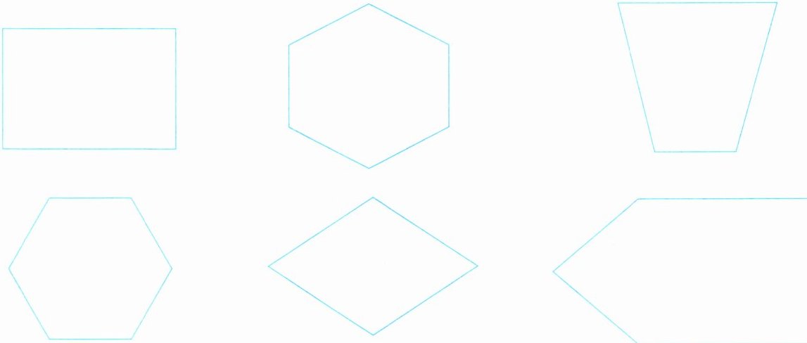 5 看,这是爷爷给农场里的鸡建的新鸡舍。请你把这些图形中有四个角的涂成红色,五个角的涂成蓝色,六个角的涂成绿色。
