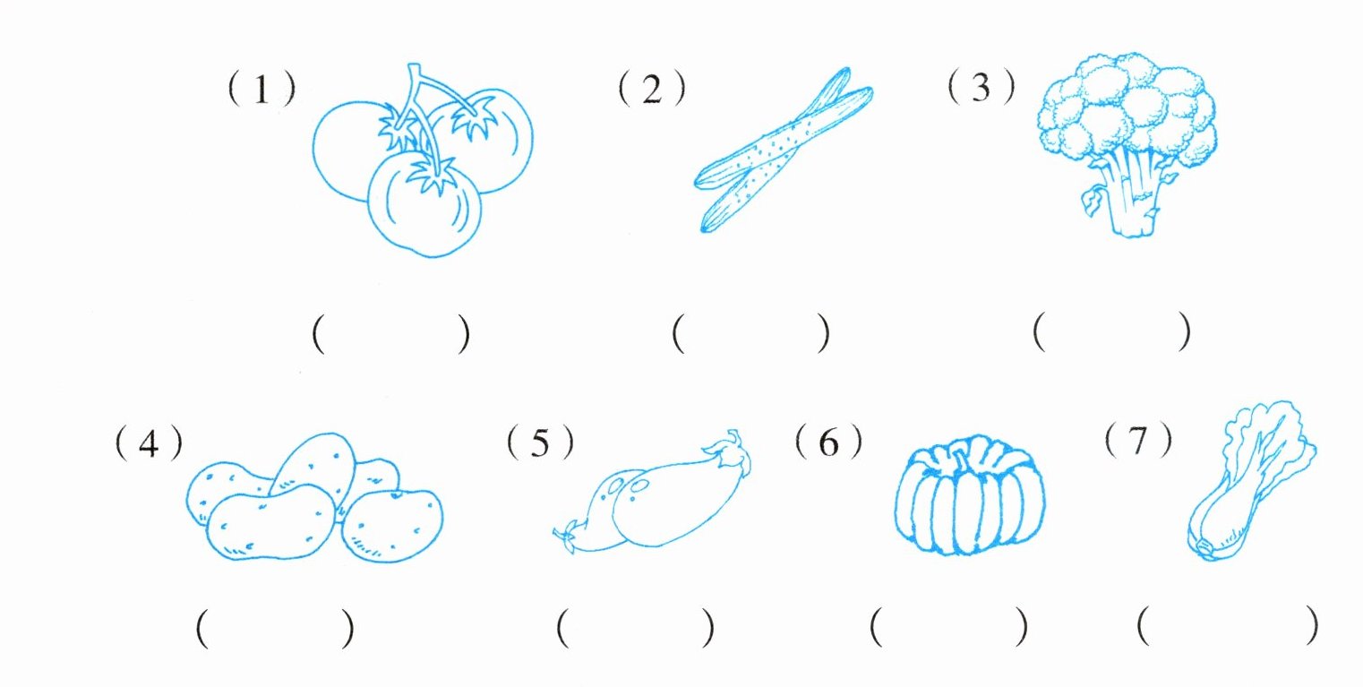 伯伯家果园的旁边有一小块菜地,里面有各种各样的蔬菜。菲菲和妈妈帮忙去菜地采摘小白菜、西红柿和茄子做午饭。请你帮菲菲在菜地中找到这三样蔬菜,并在下面画