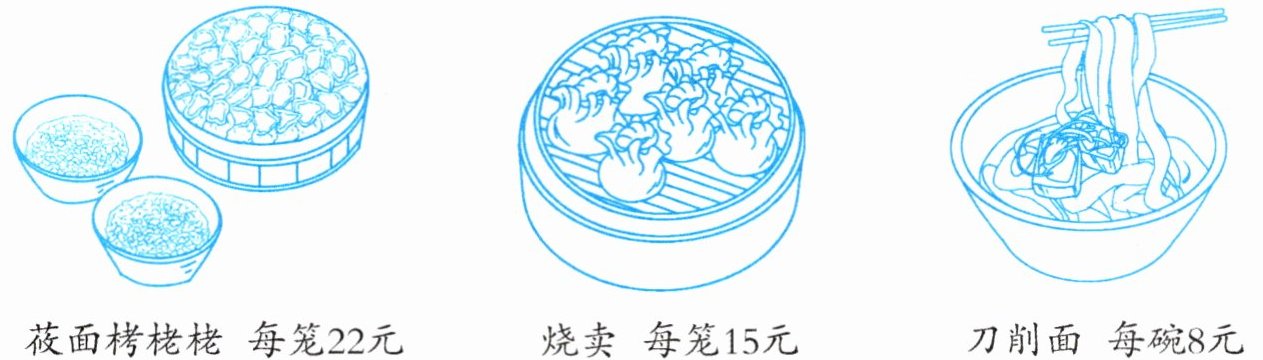 解:假设想品尝1笼烧卖和1碗刀削面(答案不唯一,可根据自己的喜好选择)。已知烧卖每笼15元,刀削面每碗8元,根据公式总价=烧卖单价+刀削面单价,可得15+8=23(元)。答:一共需要