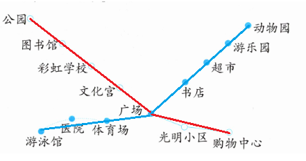 (1)1路车从公园开往购物中心,4路车从动物园开往游泳馆。请你用红色涂出1路车的行车路线,用蓝色涂出4路车的行车路线。