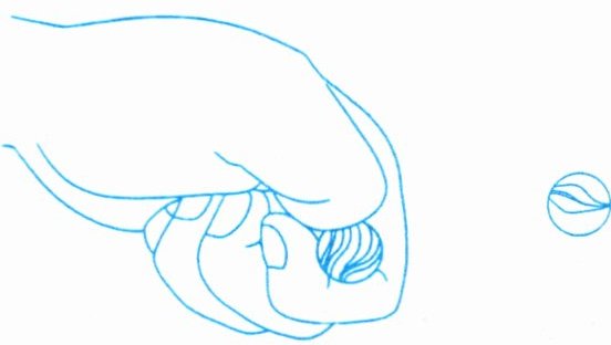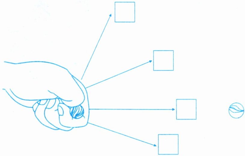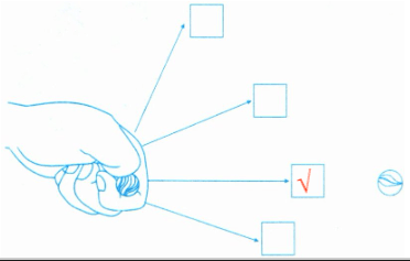 3 爸爸说,要想打到对方的弹珠必须掌握力的大小和方向。菲菲要想打到爸爸的弹珠,下面图中哪个用力方向是正确的?在正确的后面画√