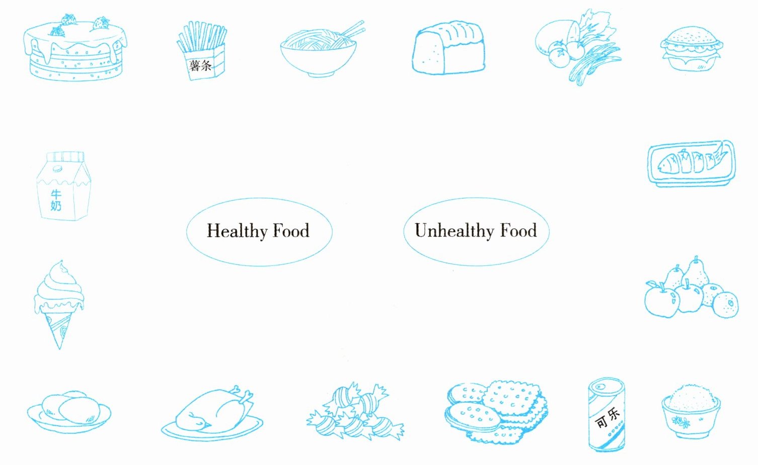 Healthy Food(健康食物):面条、面包、蔬菜、牛奶、鱼、水果、鸡蛋、鸡肉、米饭。Unhealthy Food(不健康食物):蛋糕、薯条、汉堡、冰淇淋、糖果、饼干、可乐。