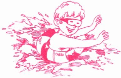 游得累了,乐乐和小伙伴们都坐在休息区休息,他们看到泳池中有一些孩子在借助游泳圈游泳。