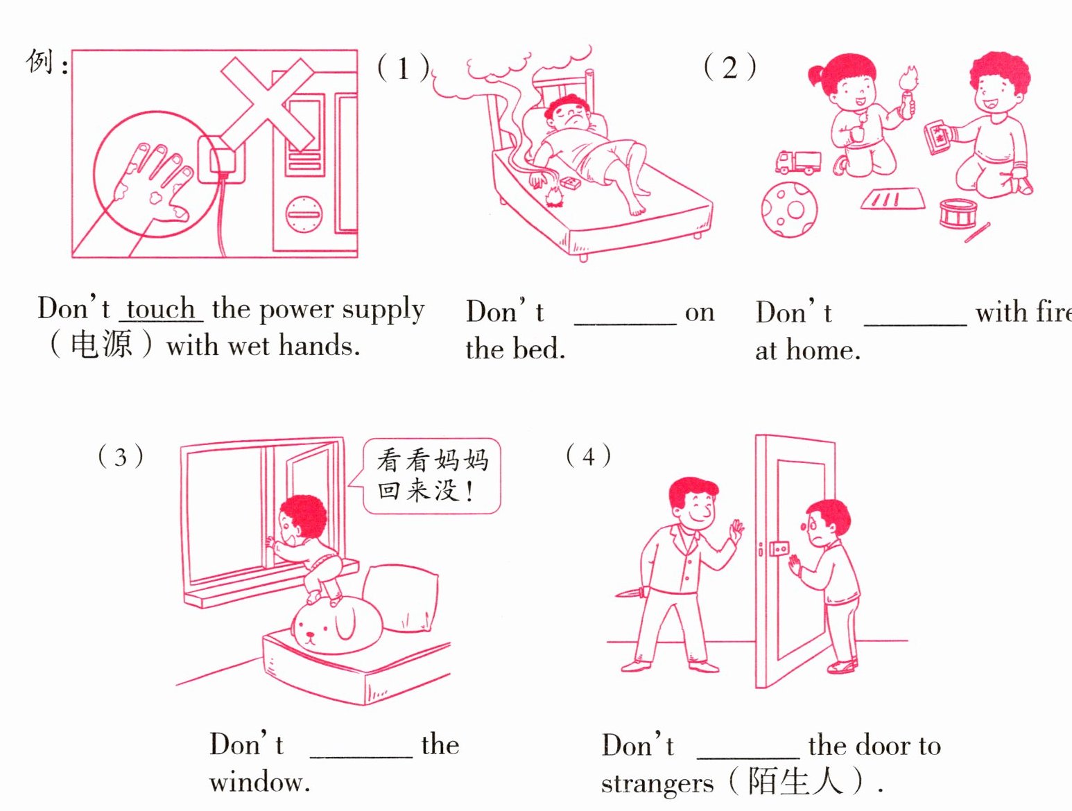 1 乐乐从家里的安全开始思考,你能帮他想想家里都有哪些安全隐患吗?观察下面图片,请将安全隐患圈出来,完成对应的句子。