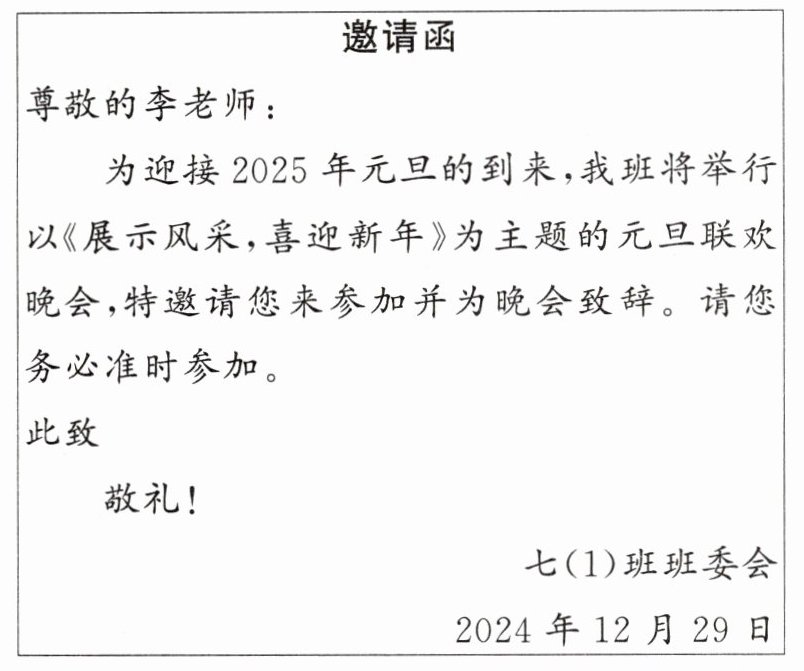 3. 为庆祝元旦,七年级一班举行元旦联欢晚会,邀请语文老师李老师参加。下面是他们给李老师写的邀请函,文中有格式、用语、标点的错误,请找出并改正。