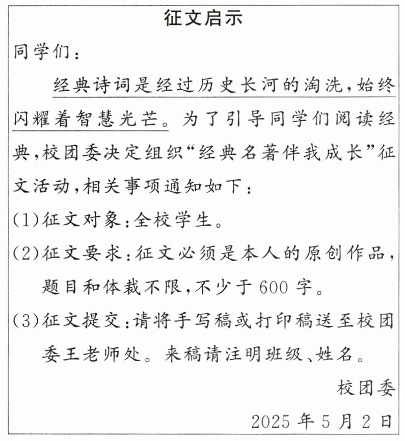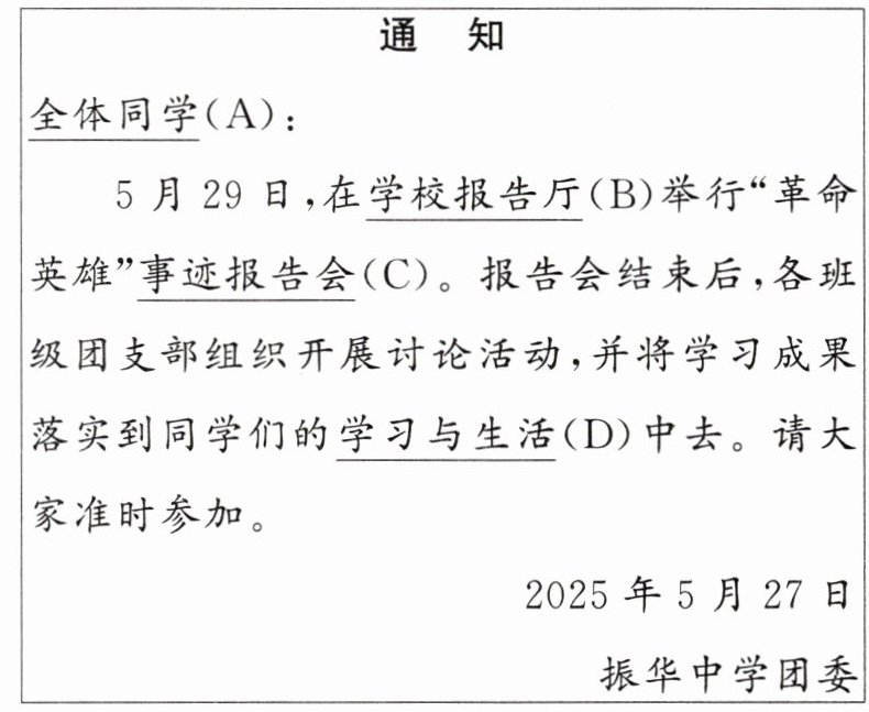 1. 振华中学决定 5 月 29 日上午 9 点在学校报告厅举行“革命英雄”事迹报告会,要求七八九三个年级学生参加,下面是学生会王明代替团委拟写的通知,请按要求作答。